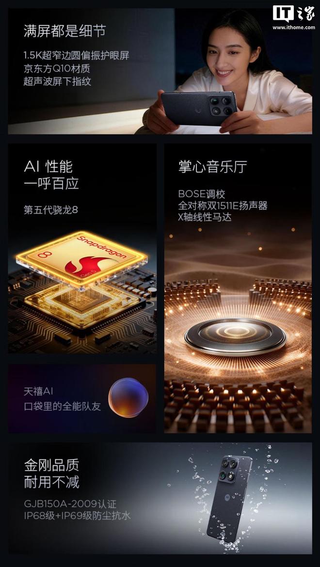 参数方面,这款手机将搭载第五代骁龙 8 芯片(骁龙 8 Gen 5),配备 1.5K 超窄边圆偏振护眼屏幕,拥有京东方 Q10 发光基材、超声波屏下指纹,配备 BOSE 调校的全对称双 1511E 扬声器以及 X 轴线性马达,支持 IP68+IP69 级防尘防水。
